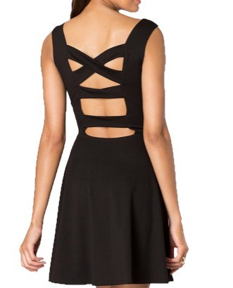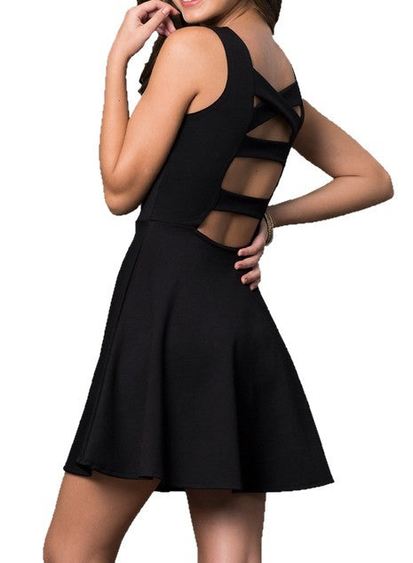 This short dress is perfect for any occasion. This sleeveless skater bottom party dress in has a high neckline and a sexy cut out bare back to show off your sexy, and trendy style. This dress is available in many fun colors making it a perfect dress for any occasion.